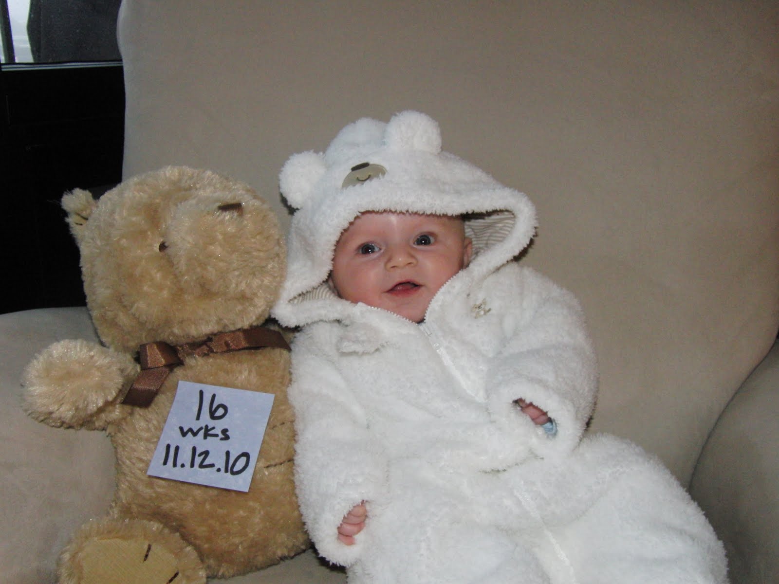 Ethan got to enjoy his first snowstorm this weekend. We bundled him up in this warm fuzzy outfit yesterday. Sure makes us appreciate our heated garage parking!
